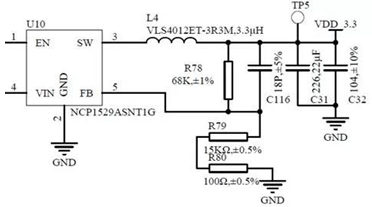 圖4黃色圈注區(qū)域(R80,C116,R79,R78)是系統(tǒng)主電源3.3V DC-DC的負(fù)反饋及補(bǔ)償網(wǎng)絡(luò)(FB部分),如圖5所示。